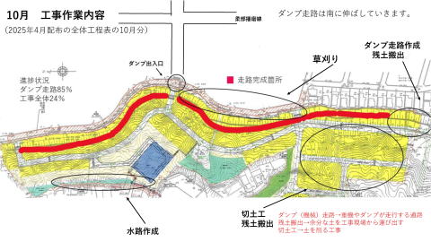 10月の工事作業内容です。図中に宅地造成工事内の工事範囲を示しています。土砂搬出仮設道路は、10月〜11月ごろに完成予定で、その後ヨナハ西側道路から国道421号線に土砂搬出が可能になります。