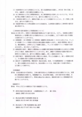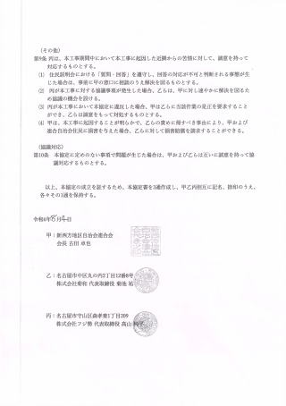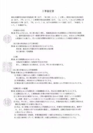 104区画の宅地造成工事に関わる、㈱菊和様、㈱フジ勢様と自治会連合会とで調印した工事協定書です。